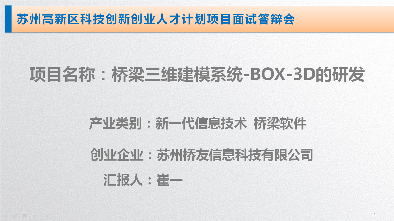 公司崔一博士携“桥梁三维建模系统-BOX-3D的研发”参加 2019年 苏州高新区科技创新创业人才(团队)评审,项目得到评审专家的一致认可,获得“创新领军人才项目”称号。